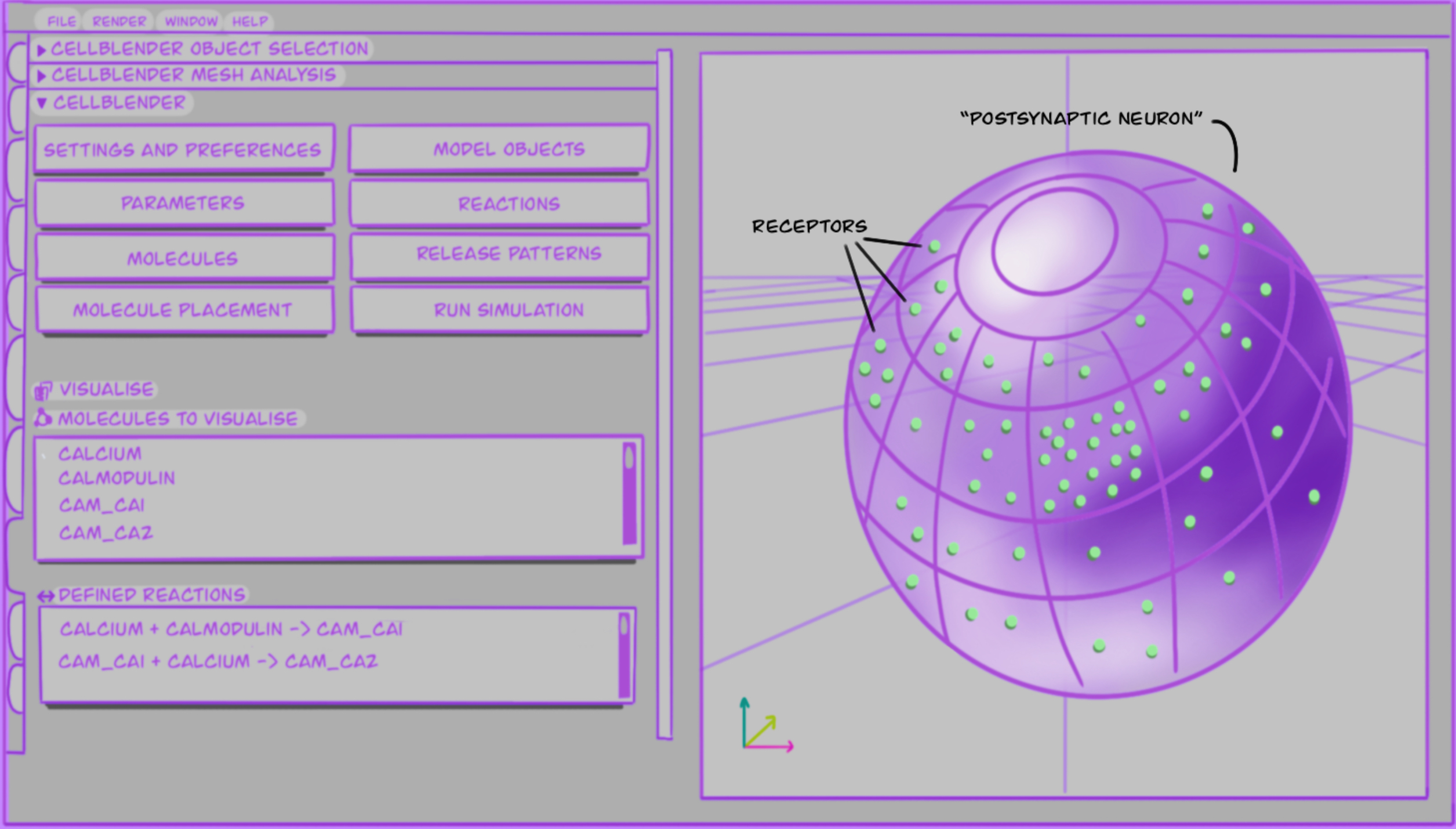 To give a better idea of what the modelling might look like, I drew Figure 1.2, which shows a somewhat simplified version of what the graphical user interface of CellBlender can look like. It includes molecules and reactions, as well as placement in a 3D cell.