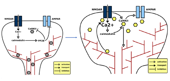 An important asset of CaMKII is that it can remain activated/ autophosphorylated for prolonged periods of time, even after the initial calcium stimulus is gone. So, when another stimulus comes along, CaMKII ‘remembers’ (as its autphosphorylated) and can now act “faster” when a new stimulus is received.Also, when activated, CaMKII can bind to NMDA receptors in the membrane of the cell to enhance its efficiency for receiving new stimuli. And in fact, it has been suggested that LTP can be maintained by the complex of activated CaMKII with NMDARs. It is this interaction that I am most interested in focusing my research on.